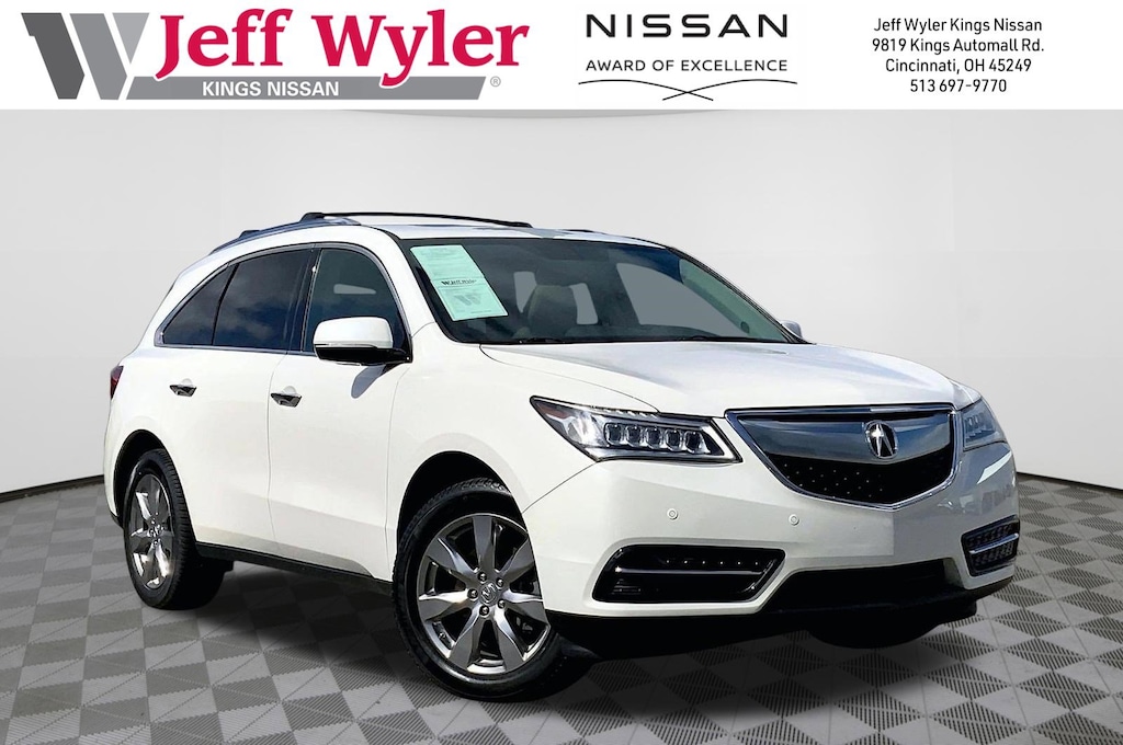 Jeff Wyler Kings Nissan is very proud to offer this wonderful 2014 Acura MDX 3.5L Advance Pkg w/Entertainment Pkg in White. Well equipped with: 12 Speakers, 19" x 8" Aluminum-Alloy Wheels, 3rd row seats: split-bench, 4-Wheel Disc Brakes, 4.25 Axle Ratio, A/V remote, ABS brakes, Adaptive suspension, Air Conditioning, Alloy wheels, AM/FM radio: XM, Anti-whiplash front head restraints, Auto tilt-away steering wheel, Auto-dimming door mirrors, Auto-dimming Rear-View mirror, Automatic temperature control, Brake assist, Bumpers: body-color, CD player, Delay-off headlights, Driver door bin, Driver vanity mirror, Dual front impact airbags, Dual front side impact airbags, DVD-Audio, Electronic Stability Control, Exterior Parking Camera Rear, Four wheel independent suspension, Front anti-roll bar, Front Bucket Seats, Front Center Armrest w/Storage, Front dual zone A/C, Front reading lights, Garage door transmitter: HomeLink, Headphones, Heads-Up Display, Heated & Ventilated Front Sport Seats, Heated door mirrors, Heated front seats, Heated rear seats, Illuminated entry, Knee airbag, Lane Departure Warning System, Leather Shift Knob, Low tire pressure warning, Memory seat, Navigation System, Occupant sensing airbag, Outside temperature display, Overhead airbag, Overhead console, Panic alarm, Passenger door bin, Passenger vanity mirror, Perforated Milano Premium Leather Seating Surfaces, Power door mirrors, Power driver seat, Power Liftgate, Power moonroof, Power passenger seat, Power steering, Power windows, Premium audio system: Acura/ELS Studio, Radio data system, Radio: Acura/ELS Studio Premium Audio System, Rain sensing wipers, Rear air conditioning, Rear anti-roll bar, Rear audio controls, Rear reading lights, Rear seat center armrest, Rear window defroster, Rear window wiper, Remote keyless entry, Roof rack: rails only, Security system, Speed control, Speed-sensing steering, Speed-Sensitive Wipers, Split folding rear seat, Spoiler, Steering wheel memory, Steering wheel mounted audio controls, Tachometer, Telescoping steering wheel, Tilt steering wheel, Traction control, Trip computer, Turn signal indicator mirrors, Variably intermittent wipers, and Ventilated front seats.