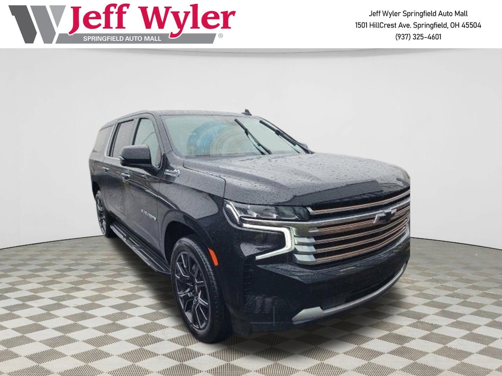 Jeff Wyler Springfield Auto Mall is very proud to offer this superb 2021 Chevrolet Suburban High Country in Black. Well equipped with: License Plate Front Mounting Package, Preferred Equipment Group 3LZ (12-Way Power Driver & Passenger Seat Adjusters, 15" Diagonal Multi-Color Head-Up Display, 1st & 2nd Row Color-Keyed Carpeted Floor Mats, 2 USB Data Ports, 2-Speed Active Electronic AutoTrac Transfer Case, 3rd Row 60/40 Power-Folding Split-Bench, Automatic Heated Steering Wheel, Bose 10-Speaker Surround w/CenterPoint, Bright Front & Rear Door Sill Plates, Chrome Door Handles w/Body-Color Strip, Color-Keyed Carpeting Floor Covering, Driver & Front Outboard Passenger Airbags, Dual Exhaust System, Enhanced Driver Information Center, Floor Console w/Storage Area, Front & Rear Park Assist, Hands-Free Rear Power Programmable Liftgate, HD Radio, HD Surround Vision, Heated & Ventilated Driver & Front Passenger Seats, Heated 2nd Row Outboard Seats, Heated Driver & Front Passenger Seats, Hill Descent Control, Infotainment Display, Inside Rearview Auto-Dimming Rear Camera Mirror, Lane Change Alert w/Side Blind Zone Alert, Lane Keep Assist w/Lane Departure Warning, Leather-Wrapped Steering Wheel, LED Daytime Running Lamps, Memory Settings, Outside Heated Power-Adjustable Mirrors, Power Release 2nd Row Bucket Seats, Power Tilt & Telescopic Steering Column, Rear Camera Mirror Washer, Rear Cross Traffic Alert, Rear Pedestrian Alert, Remote Start, Safety Alert Seat, SiriusXM Radio w/360L, and Universal Home Remote), 10 Speakers, 3.23 Rear Axle Ratio, 3rd row seats: split-bench, 4-Wheel Disc Brakes, ABS brakes, Adaptive suspension, Air Conditioning, Alloy wheels, AM/FM radio: SiriusXM with 360L, Apple CarPlay/Android Auto, Auto High-beam Headlights, Auto-dimming door mirrors, Auto-dimming Rear-View mirror, Auto-leveling suspension, Automatic temperature control, Brake assist, Bumpers: body-color, Compass, Delay-off headlights, Driver door bin, Driver vanity mirror, Dual front impact airbags, Dual front side impact airbags, Electronic Stability Control, Emergency communication system: OnStar and Chevrolet connected services capable, Four wheel independent suspension, Front & Rear Black Bowtie Emblems (LPO), Front anti-roll bar, Front Bucket Seats, Front Center Armrest, Front dual zone A/C, Front reading lights, Fully automatic headlights, Garage door transmitter, Heads-Up Display, Heated door mirrors, Heated front seats, Heated rear seats, Heated steering wheel, Illuminated entry, Leather steering wheel, Low tire pressure warning, Magnetic Ride Control Suspension, Memory seat, Navigation System, Occupant sensing airbag, Outside temperature display, Overhead airbag, Overhead console, Panic alarm, Passenger door bin, Passenger vanity mirror, Perforated Leather Seating Surfaces, Power door mirrors, Power driver seat, Power Liftgate, Power passenger seat, Power steering, Power windows, Premium audio system: Chevrolet Infotainment 3 Premium, Radio: Chevrolet Infotainment 3 Premium System, Rain sensing wipers, Rear air conditioning, Rear anti-roll bar, Rear reading lights, Rear window defroster, Rear window wiper, Remote keyless entry, Roof rack: rails only, Security system, Speed control, Speed-sensing steering, Split folding rear seat, Spoiler, Steering wheel memory, Steering wheel mounted audio controls, Tachometer, Telescoping steering wheel, Tilt steering wheel, Traction control, Trip computer, Turn signal indicator mirrors, Variably intermittent wipers, Ventilated front seats, Voltmeter, Wheel Locks (Set of 4) (LPO), Wheels: 22" Carbon Flash Metallic (LPO), Wheels: 22" Steel (LPO), and Wheels: 22" x 9" Sterling Silver Premium Painted. Ask about available certifications. Used vehicles 10 years of age or newer with less than 100,000 miles are eligible for the Wyler Assurance Program, but eligible vehicles must pass our reconditioning process and multi-point inspection. Provided the vehicle passes inspection, vehicles will be eligible for the 6 mon