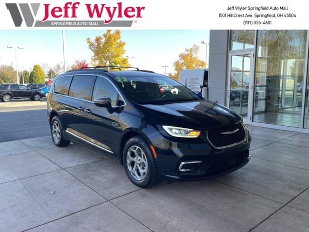 Jeff Wyler Springfield Auto Mall is pleased to offer this wonderful 2022 Chrysler Pacifica Limited in Brilliant Black Crystal Pearlcoat. Well equipped with: Quick Order Package 27P, 19 Speakers, 3.73 Axle Ratio, 3rd row seats: split-bench, 4-Wheel Disc Brakes, ABS brakes, Air Conditioning, Alloy wheels, AM/FM radio: SiriusXM 360L, Apple CarPlay/Android Auto, Audio memory, Auto Adjust In Reverse Exterior Mirrors, Auto-dimming door mirrors, Auto-Dimming Exterior Driver Mirror, Auto-dimming Rear-View mirror, Automatic temperature control, AWD Suspension, Black Seats, Bodyside moldings, Brake assist, Bumpers: body-color, Chrome/Body Color Exterior Mirrors, Compass, Delay-off headlights, Driver door bin, Driver vanity mirror, Driver's Seat Mounted Armrest, Dual front impact airbags, Dual front side impact airbags, Electronic Stability Control, Emergency communication system: SiriusXM Guardian, Exterior Mirrors Courtesy Lamps, Exterior Mirrors w/Heating Element, Exterior Mirrors w/Memory, Exterior Mirros w/Supplemental Signals, Four wheel independent suspension, Front anti-roll bar, Front Bucket Seats, Front dual zone A/C, Front fog lights, Front reading lights, Fully automatic headlights, Garage door transmitter: HomeLink, harman/kardon® Speakers, Heated door mirrors, Heated front seats, Heated rear seats, Heated steering wheel, Illuminated entry, Knee airbag, Low tire pressure warning, Memory seat, Navigation System, Occupant sensing airbag, Outside temperature display, Overhead airbag, Overhead console, Panic alarm, ParkView Rear Back-Up Camera, Passenger door bin, Passenger seat mounted armrest, Passenger vanity mirror, Power door mirrors, Power driver seat, Power Liftgate, Power Mirrors Manual Folding, Power moonroof, Power passenger seat, Power steering, Power windows, Premium Leather Trim Bucket Seats, Radio data system, Radio: Uconnect 5 Nav w/10.1 Display, Rain sensing wipers, Rear air conditioning, Rear reading lights, Rear window defroster, Rear window wiper, Reclining 3rd row seat, Remote keyless entry, Roof rack, Security system, Speed control, Split folding rear seat, Spoiler, Steering wheel mounted audio controls, Tachometer, Telescoping steering wheel, Tilt steering wheel, Traction control, Trip computer, Turn signal indicator mirrors, Variably intermittent wipers, Ventilated front seats, Voltmeter, and Wheels: 18 x 7.5 Painted Aluminum Design 2. Ask about available certifications. Used vehicles 10 years of age or newer with less than 100,000 miles are eligible for the Wyler Assurance Program, but eligible vehicles must pass our reconditioning process and multi-point inspection. Provided the vehicle passes inspection, vehicles will be eligible for the 6 month/6,000 mile limited warranty. The 6 month/6,000 mile limited warranty is NOT available on AS-IS vehicles, wholesale vehicles, lease buyback/pass-thru vehicles or un-inspected vehicles. Note that this program can also apply to vehicles where the remaining factory coverage is less than 6 months or 6,000 miles. Please check the Federal Trade Commission (FTC) Buyers guide on the vehicle for full details as to whether or not warranty coverage may apply. Contact Dealer for additional details. The Wyler Assurance 6 month/6,000 Mile limited warranty ends 6 months from the date of the Retail Purchase Agreement (BUYERS ORDER) or when the vehicle's odometer registers 6,000 additional miles to the mileage listed on the BUYERS ORDER, whichever comes first. Your Deductible - The warranty holder on your contract pays the first $100 of each covered repair.