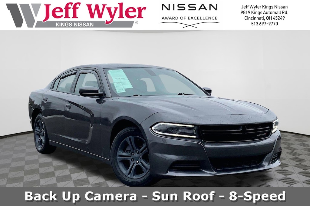 Jeff Wyler Kings Nissan is pleased to offer this gorgeous 2019 Dodge Charger SXT in Granite Crystal Metallic Clearcoat. Well equipped with: Quick Order Package 2EG (DISC), Black Leather, 4-Wheel Disc Brakes, 6 Speakers, ABS brakes, Air Conditioning, Alloy wheels, AM/FM radio: SiriusXM, Anti-whiplash front head restraints, Apple CarPlay/Android Auto, Brake assist, Bumpers: body-color, Cloth Sport Seat, Compass, Delay-off headlights, Driver door bin, Driver vanity mirror, Dual front impact airbags, Dual front side impact airbags, Electronic Stability Control, Four wheel independent suspension, Front anti-roll bar, Front Bucket Seats, Front Center Armrest, Front dual zone A/C, Front reading lights, Fully automatic headlights, Illuminated entry, Knee airbag, Leather Shift Knob, Low tire pressure warning, Manufacturer's Statement of Origin, Occupant sensing airbag, Outside temperature display, Overhead airbag, Overhead console, Panic alarm, ParkView Rear Back-Up Camera, Passenger door bin, Passenger vanity mirror, Power 4-Way Driver Lumbar Adjust, Power door mirrors, Power driver seat, Power steering, Power Sunroof, Power windows, Radio: Uconnect 4 w/7" Display, Rear anti-roll bar, Rear Armrest w/Cupholder Seat, Rear reading lights, Rear seat center armrest, Rear window defroster, Remote keyless entry, Speed control, Speed-Sensitive Wipers, Split folding rear seat, Steering wheel mounted audio controls, Tachometer, Telescoping steering wheel, Tilt steering wheel, Traction control, Trip computer, Variably intermittent wipers, and Wheels: 17" x 7.0" Painted Cast Aluminum.Ask about available certifications.