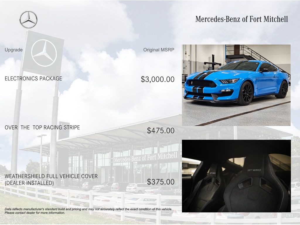 AM/FM Stereo & CD Player, Dual-Zone Electronic Automatic Temperature Control, Electronics Package, Exterior Parking Camera Rear, GT350 Equipment Group 900A, High-Intensity Discharge Headlights, RECARO Cloth/Miko Suede Sport Seats, SYNC 3 Communications & Entertainment System, Turn Signal Mirrors, Universal Garage Door Opener (UGDO), Voice-Activated Touch-Screen Navigation System, Wheels: 19" x 10.5" Fr/19" x 11" Rr Ebony Black.