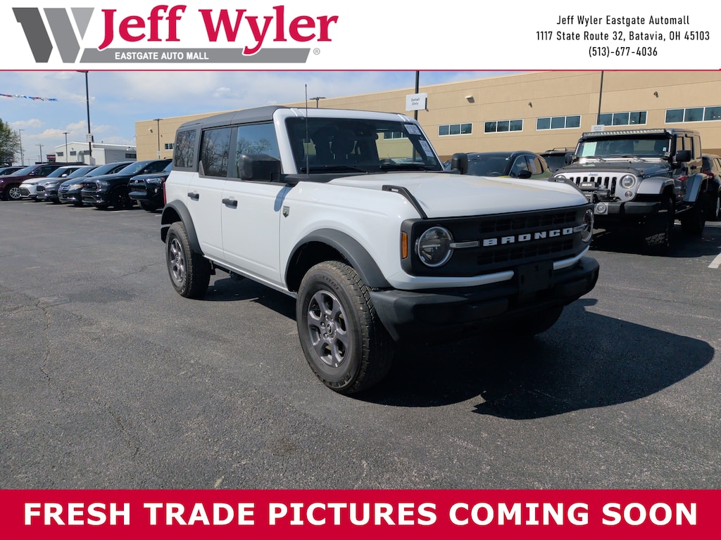 Jeff Wyler Eastgate Auto Mall is delighted to offer this terrific 2025 Ford Bronco Big Bend in Oxford White. Well equipped with: Equipment Group 222A Mid Package (2-Door Intelligent Access w/Lock/Unlock, Ambient Footwell Lighting, Connected Navigation, Dr & Pass Illuminated Sliding Visor Vanity Mirrors, Dual Smart Charging USB Ports, Dual-Zone Electronic Automatic Temperature Control, Front Row Heated Seats, Power Outlet - Back Side of Center Floor Console, and Rear Parking Sensors), 4-Wheel Disc Brakes, 4.46 Axle Ratio, 7 Speakers, ABS brakes, Air Conditioning, Alloy wheels, AM/FM radio: SiriusXM with 360L, AM/FM Stereo, Auto High-Beam Headlamps, Auto High-beam Headlights, BLIS Blind Spot Information System, Brake assist, Carbonized Gray Molded-In-Color Hard Top, Cloth Bucket Seats, Compass, Delay-off headlights, Driver door bin, Driver vanity mirror, Dual front impact airbags, Dual front side impact airbags, Electronic Stability Control, Emergency communication system: 911 Assist, Exterior Parking Camera Rear, Front anti-roll bar, Front Bucket Seats, Front Center Armrest, Front License Plate Bracket, Front reading lights, Front wheel independent suspension, Fully automatic headlights, Heated door mirrors, Illuminated entry, Integrated roll-over protection, Internet access capable: FordPass Connect, Lane-Keeping System, Leather Shift Knob, Low tire pressure warning, Occupant sensing airbag, Outside temperature display, Overhead airbag, Overhead console, Panic alarm, Passenger door bin, Passenger vanity mirror, Power door mirrors, Power steering, Power windows, Pre-Collision Assist w/Automatic Emergency Braking, Radio data system, Rear-View Camera, Rear-Window Defroster & Washer, Remote keyless entry, Security system, SiriusXM w/360L, Speed control, Split folding rear seat, Steering wheel mounted audio controls, SYNC 4, Tachometer, Telescoping steering wheel, Tilt steering wheel, Traction control, Trip computer, Variably intermittent wipers, and Wheels: 17" Carbonized Gray-Painted Aluminum. CARFAX One-Owner. Ask about available certifications. Used vehicles 10 years of age or newer with less than 100,000 miles are eligible for the Wyler Assurance Program, but eligible vehicles must pass our reconditioning process and multi-point inspection. Provided the vehicle passes inspection, vehicles will be eligible for the 6 month/6,000 mile limited warranty. The 6 month/6,000 mile limited warranty is NOT available on AS-IS vehicles, wholesale vehicles, lease buyback/pass-thru vehicles or un-inspected vehicles. Note that this program can also apply to vehicles where the remaining factory coverage is less than 6 months or 6,000 miles. Please check the Federal Trade Commission (FTC) Buyers guide on the vehicle for full details as to whether or not warranty coverage may apply. Contact Dealer for additional details. The Wyler Assurance 6 month/6,000 Mile limited warranty ends 6 months from the date of the Retail Purchase Agreement (BUYERS ORDER) or when the vehicle's odometer registers 6,000 additional miles to the mileage listed on the BUYERS ORDER, whichever comes first. Your Deductible - The warranty holder on your contract pays the first $100 of each covered repair.