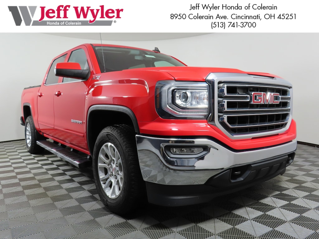Jeff Wyler Honda of Colerain is proud to offer this good-looking 2017 GMC Sierra 1500 SLE in Cardinal Red. Well equipped with: Off-Road Suspension Package (Hill Descent Control and Wheels: 18" x 8.5" Bright Machined Aluminum), Preferred Equipment Group 3SA (150 Amp Alternator, 2-Speed Active Electronic AutoTrac Transfer Case, 4.2" Diagonal Color Display Driver Info Center, Body Color Bodyside Moldings, Body Color Door Handles, Body Color Power Adjustable Heated Outside Mirrors, Body-Color Mirror Caps, Color-Keyed Carpeting, Deep-Tinted Glass, Driver & Front Passenger Illuminated Vanity Mirrors, EZ Lift & Lower Tailgate, Front Frame-Mounted Black Recovery Hooks, Heavy-Duty Rear Locking Differential, Leather Wrapped Steering Wheel w/Cruise Controls, LED Cargo Box Lighting, OnStar 3 Month Guidance Plan, OnStar w/4G LTE, Power Windows w/Driver Express Up & Down, Rear 60/40 Folding Bench Seat (Folds Up), Rear Vision Camera, Rear Wheelhouse Liners, Remote Keyless Entry, Remote Locking Tailgate, Rubberized-Vinyl Front Floor Mats, Rubberized-Vinyl Rear Floor Mats, Single Slot CD/MP3 Player, Single-Zone Air Conditioning, and Steering Wheel Audio Controls), SLE Value Package (10-Way Power Driver's Seat Adjuster, 110-Volt AC Power Outlet, Dual-Zone Automatic Climate Control, Electric Rear-Window Defogger, Remote Vehicle Starter System, Theft Deterrent System (Unauthorized Entry), Thin Profile LED Fog Lamps, and Universal Home Remote), Trailering Equipment, 4-Wheel Disc Brakes, 40/20/40 Front Split Bench Seat, 6 Speakers, 6-Speaker Audio System, 720 CCA/80 Amp-hr Maintenance Free HD Battery, ABS brakes, Air Conditioning, Alloy wheels, AM/FM radio, Auxiliary External Transmission Oil Cooler, Bodyside moldings, Brake assist, Bumpers: chrome, CD player, Cloth Seat Trim, Compass, Delay-off headlights, Driver door bin, Driver vanity mirror, Dual front impact airbags, Dual front side impact airbags, Electronic Stability Control, Emergency communication system: OnStar Guidance, Exterior Parking Camera Rear, Front anti-roll bar, Front Center Armrest w/Storage, Front License Plate Kit, Front reading lights, Front wheel independent suspension, Fully automatic headlights, HD Radio, Heated door mirrors, Heated Driver & Front Passenger Seats, Heavy Duty Suspension, High-Intensity Discharge Headlights, Illuminated entry, Integrated Trailer Brake Controller, Low tire pressure warning, Manual Tilt/Telescoping Steering Column, Occupant sensing airbag, Outside temperature display, Overhead airbag, Overhead console, Panic alarm, Passenger door bin, Passenger vanity mirror, Power door mirrors, Power steering, Power windows, Radio data system, Radio: AM/FM Stereo w/8" Diagonal Color Touch Screen, Rear reading lights, Rear seat center armrest, Rear step bumper, Remote keyless entry, SiriusXM Satellite Radio, Speed control, Speed-sensing steering, Split folding rear seat, Steering wheel mounted audio controls, Tachometer, Tilt steering wheel, Traction control, Trip computer, Variably intermittent wipers, Voltmeter, and Wheels: 17" x 8" Bright Machined Aluminum.