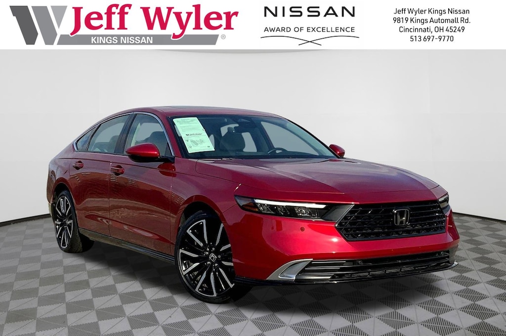 Jeff Wyler Kings Nissan is excited to offer this great 2023 Honda Accord Hybrid Touring in . Well equipped with: 2.0L 16V DOHC, 12 Speakers, 4-Wheel Disc Brakes, ABS brakes, Adaptive Cruise Control: Adaptive Cruise Control (ACC) with Low-Speed Follow, Adaptive suspension, Air Conditioning, Alloy wheels, AM/FM radio, Apple CarPlay/Android Auto, Auto High-beam Headlights, Auto-dimming Rear-View mirror, Automatic temperature control, Bose Premium Sound System, Brake assist, Bumpers: body-color, Compass, Delay-off headlights, Driver door bin, Driver vanity mirror, Dual front impact airbags, Dual front side impact airbags, Electronic Stability Control, Emergency communication system: HondaLink, Exterior Parking Camera Rear, Four wheel independent suspension, Front anti-roll bar, Front Bucket Seats, Front Center Armrest, Front dual zone A/C, Front reading lights, Fully automatic headlights, Heads-Up Display, Heated & Ventilated Front Bucket Seats, Heated door mirrors, Heated front seats, Heated rear seats, Illuminated entry, Knee airbag, Lane departure: Lane Keeping Assist System (LKAS) active, Leather Shift Knob, Leather steering wheel, Leather-Trimmed Seat Trim, Low tire pressure warning, Memory seat, Navigation system: Google Built-In, Occupant sensing airbag, Outside temperature display, Overhead airbag, Overhead console, Panic alarm, Passenger door bin, Passenger vanity mirror, Power door mirrors, Power driver seat, Power moonroof, Power passenger seat, Power steering, Power windows, Radio data system, Rain sensing wipers, Rear anti-roll bar, Rear reading lights, Rear seat center armrest, Rear side impact airbag, Rear window defroster, Remote keyless entry, Security system, Speed control, Speed-sensing steering, Speed-Sensitive Wipers, Split folding rear seat, Steering wheel mounted audio controls, Telescoping steering wheel, Tilt steering wheel, Traction control, Trip computer, Turn signal indicator mirrors, Variably intermittent wipers, Ventilated front seats, and Wheels: 19" x 8.5J Berlina Black.Ask about available certifications.