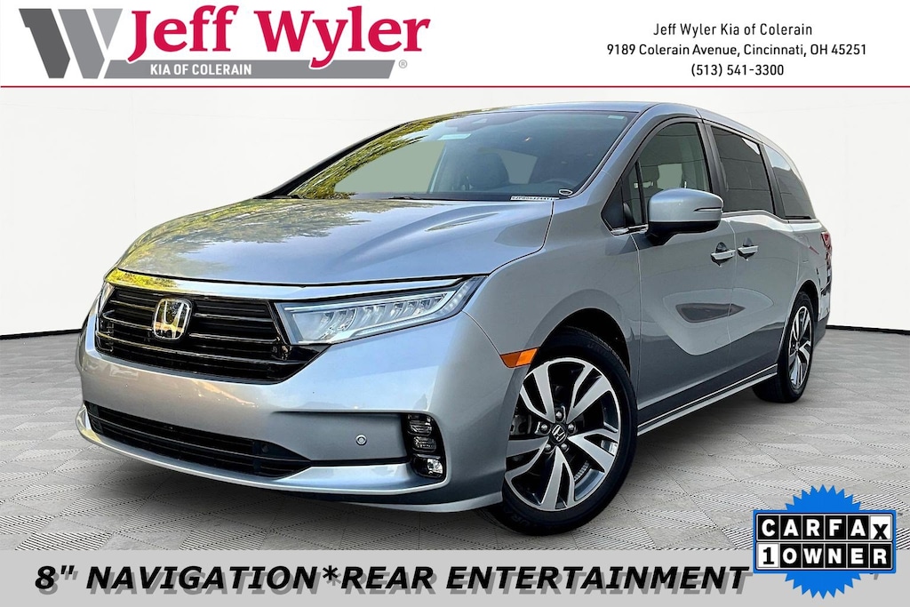 Jeff Wyler Kia of Colerain is honored to offer this great-looking 2023 Honda Odyssey Touring in Lunar Silver Metallic. 3.61 Axle Ratio, 3rd row seats: split-bench, 4-Wheel Disc Brakes, 7 Speakers, A/V remote: CabinControl, ABS brakes, Adaptive Cruise Control: Adaptive Cruise Control (ACC) with Low-Speed Follow, Air Conditioning, Alloy wheels, AM/FM radio: SiriusXM, Anti-whiplash front head restraints, Apple CarPlay/Android Auto, Auto High-beam Headlights, Auto-dimming Rear-View mirror, Automatic temperature control, Blind Spot Information (BSI) System warning, Brake assist, Bumpers: body-color, CD player, Compass, Delay-off headlights, Driver door bin, Driver vanity mirror, Driver's Seat Mounted Armrest, Dual front impact airbags, Dual front side impact airbags, DVD-Audio, Electronic Stability Control, Emergency communication system: HondaLink, Exterior Parking Camera Rear, Four wheel independent suspension, Front anti-roll bar, Front Bucket Seats, Front dual zone A/C, Front fog lights, Front reading lights, Fully automatic headlights, Garage door transmitter: HomeLink, Headphones, Heated door mirrors, Heated Front Bucket Seats, Heated front seats, Illuminated entry, Knee airbag, Lane departure: Lane Keeping Assist System (LKAS) active, Leather Seat Trim, Leather steering wheel, Low tire pressure warning, Memory seat, Navigation system: Honda Satellite-Linked Navigation System, Occupant sensing airbag, Outside temperature display, Overhead airbag, Overhead console, Panic alarm, Passenger door bin, Passenger seat mounted armrest, Passenger vanity mirror, Power door mirrors, Power driver seat, Power Liftgate, Power moonroof, Power passenger seat, Power steering, Power windows, Radio data system, Radio: 160-Watt AM/FM/HD/SiriusXM Audio System, Rear air conditioning, Rear anti-roll bar, Rear audio controls, Rear reading lights, Rear seat center armrest, Rear window defroster, Rear window wiper, Reclining 3rd row seat, Remote keyless entry, Security system, Speed control, Speed-sensing steering, Speed-Sensitive Wipers, Split folding rear seat, Spoiler, Steering wheel mounted audio controls, Tachometer, Telescoping steering wheel, Tilt steering wheel, Traction control, Trip computer, Turn signal indicator mirrors, Variably intermittent wipers, and Wheels: 19" Machine-Finished Alloy Our PRE-OWNED vehicles are put through a rigorous 167- POINT QUALITY ASSURANCE INSPECTION along with an average amount of over $1,400.00 SPENT to recondition each vehicle so we can be sure to deliver you the highest quality vehicle like you deserve! ***ONLINE PRICE DOES NOT INCLUDE WYLER FAMILY FIRST PACKAGE***