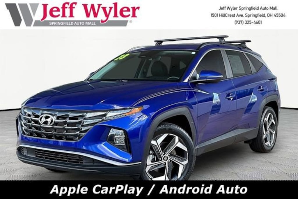 Jeff Wyler Springfield Auto Mall is honored to offer this superb-looking 2023 Hyundai Tucson SEL in Intense Blue. Well equipped with: Convenience Package (10.25 Digital Instrument Cluster, Auto-Dimming Interior Mirror w/Homelink, Dual Automatic Temperature Control, H-Tex Seat Trim, Leather-Wrapped Shift Knob, Leather-Wrapped Steering Wheel, LED Interior Lights (Room, Map), Option Group 02, Power Sunroof, Ultrasonic Rear Occupant Alert, and Wheels: 19 x 7.5J Machine-Face Finish Alloy), 3.648 Axle Ratio, 4-Wheel Disc Brakes, 6 Speakers, ABS brakes, Air Conditioning, Alloy wheels, AM/FM radio: SiriusXM, Apple CarPlay & Android Auto, Auto High-beam Headlights, Brake assist, Bumpers: body-color, Cargo Net, Carpeted Floor Mats, Delay-off headlights, Driver door bin, Driver vanity mirror, Dual front impact airbags, Dual front side impact airbags, Electronic Stability Control, Emergency communication system: Blue Link Connected Car Service (3-year complimentary subscription), First Aid Kit, Four wheel independent suspension, Front anti-roll bar, Front Bucket Seats, Front Center Armrest, Front reading lights, Fully automatic headlights, Heated door mirrors, Heated Front Bucket Seats, Heated front seats, Illuminated entry, Low tire pressure warning, Occupant sensing airbag, Outside temperature display, Overhead airbag, Overhead console, Panic alarm, Passenger door bin, Passenger vanity mirror, Power door mirrors, Power driver seat, Power Liftgate, Power steering, Power windows, Radio data system, Radio: AM/FM/HD/SiriusXM Audio System, Rear anti-roll bar, Rear seat center armrest, Rear window defroster, Rear window wiper, Remote keyless entry, Roof Rack Cross Rails (DISC), Roof rack: rails only, Security system, Speed control, Split folding rear seat, Spoiler, Stain & Odor Resistant Cloth Seat Trim, Steering wheel mounted audio controls, Tachometer, Telescoping steering wheel, Tilt steering wheel, Traction control, Trip computer, Turn signal indicator mirrors, Variably intermittent wipers, and Wheels: 17 x 7.0J Alloy. Ask about available certifications. Used vehicles 10 years of age or newer with less than 100,000 miles are eligible for the Wyler Assurance Program, but eligible vehicles must pass our reconditioning process and multi-point inspection. Provided the vehicle passes inspection, vehicles will be eligible for the 6 month/6,000 mile limited warranty. The 6 month/6,000 mile limited warranty is NOT available on AS-IS vehicles, wholesale vehicles, lease buyback/pass-thru vehicles or un-inspected vehicles. Note that this program can also apply to vehicles where the remaining factory coverage is less than 6 months or 6,000 miles. Please check the Federal Trade Commission (FTC) Buyers guide on the vehicle for full details as to whether or not warranty coverage may apply. Contact Dealer for additional details. The Wyler Assurance 6 month/6,000 Mile limited warranty ends 6 months from the date of the Retail Purchase Agreement (BUYERS ORDER) or when the vehicle's odometer registers 6,000 additional miles to the mileage listed on the BUYERS ORDER, whichever comes first. Your Deductible - The warranty holder on your contract pays the first $100 of each covered repair.