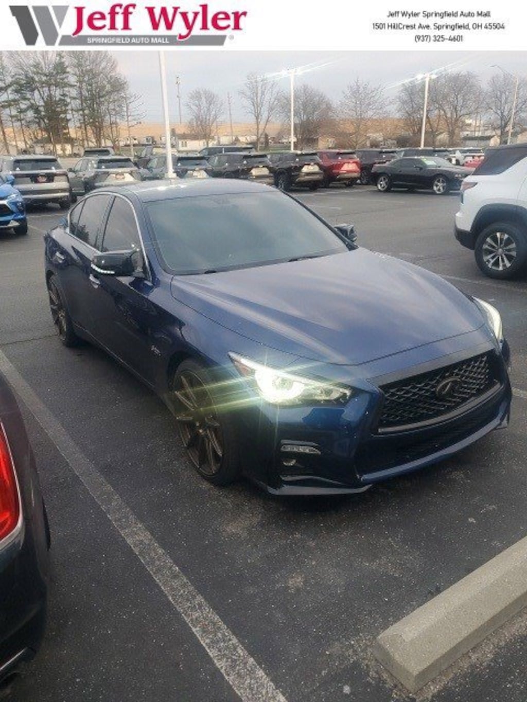 Jeff Wyler Springfield Auto Mall is pleased to offer this handsome 2019 INFINITI Q50 Red Sport 400 in Blue. Well equipped with: 4-Wheel Disc Brakes, 6 Speakers, ABS brakes, Adaptive suspension, Air Conditioning, Alloy wheels, AM/FM radio: SiriusXM, Anti-whiplash front head restraints, Auto-dimming Rear-View mirror, Automatic temperature control, Brake assist, Bumpers: body-color, CD player, Compass, Delay-off headlights, Driver door bin, Driver vanity mirror, Dual front impact airbags, Dual front side impact airbags, Electronic Stability Control, Emergency communication system: INFINITI Connection, Four wheel independent suspension, Front anti-roll bar, Front Bucket Seats, Front Center Armrest, Front dual zone A/C, Front fog lights, Front reading lights, Fully automatic headlights, Garage door transmitter: HomeLink, Heated door mirrors, Heated front seats, Heated Front Sport Seats, Heated steering wheel, Illuminated entry, Leather Shift Knob, Leather steering wheel, Low tire pressure warning, Navigation system: INFINITI InTouch Navigation, Occupant sensing airbag, Outside temperature display, Overhead airbag, Overhead console, Panic alarm, Passenger door bin, Passenger vanity mirror, Power door mirrors, Power driver seat, Power moonroof, Power passenger seat, Power steering, Power windows, Quilted Semi-Aniline Leather Seating Surfaces, Radio data system, Radio: INFINITI InTouch Navigation, Rain sensing wipers, Rear anti-roll bar, Rear reading lights, Rear seat center armrest, Rear window defroster, Remote keyless entry, Security system, Speed control, Speed-sensing steering, Speed-Sensitive Wipers, Split folding rear seat, Steering wheel mounted audio controls, Tachometer, Telescoping steering wheel, Tilt steering wheel, Traction control, Trip computer, Turn signal indicator mirrors, Variably intermittent wipers, and Wheels: 19 x 9 Aluminum-Alloy. Awards:* 2019 KBB.com 10 Best Luxury Cars Under $35,000 Ask about available certifications. Used vehicles 10 years of age or newer with less than 100,000 miles are eligible for the Wyler Assurance Program, but eligible vehicles must pass our reconditioning process and multi-point inspection. Provided the vehicle passes inspection, vehicles will be eligible for the 6 month/6,000 mile limited warranty. The 6 month/6,000 mile limited warranty is NOT available on AS-IS vehicles, wholesale vehicles, lease buyback/pass-thru vehicles or un-inspected vehicles. Note that this program can also apply to vehicles where the remaining factory coverage is less than 6 months or 6,000 miles. Please check the Federal Trade Commission (FTC) Buyers guide on the vehicle for full details as to whether or not warranty coverage may apply. Contact Dealer for additional details. The Wyler Assurance 6 month/6,000 Mile limited warranty ends 6 months from the date of the Retail Purchase Agreement (BUYERS ORDER) or when the vehicle's odometer registers 6,000 additional miles to the mileage listed on the BUYERS ORDER, whichever comes first. Your Deductible - The warranty holder on your contract pays the first $100 of each covered repair.