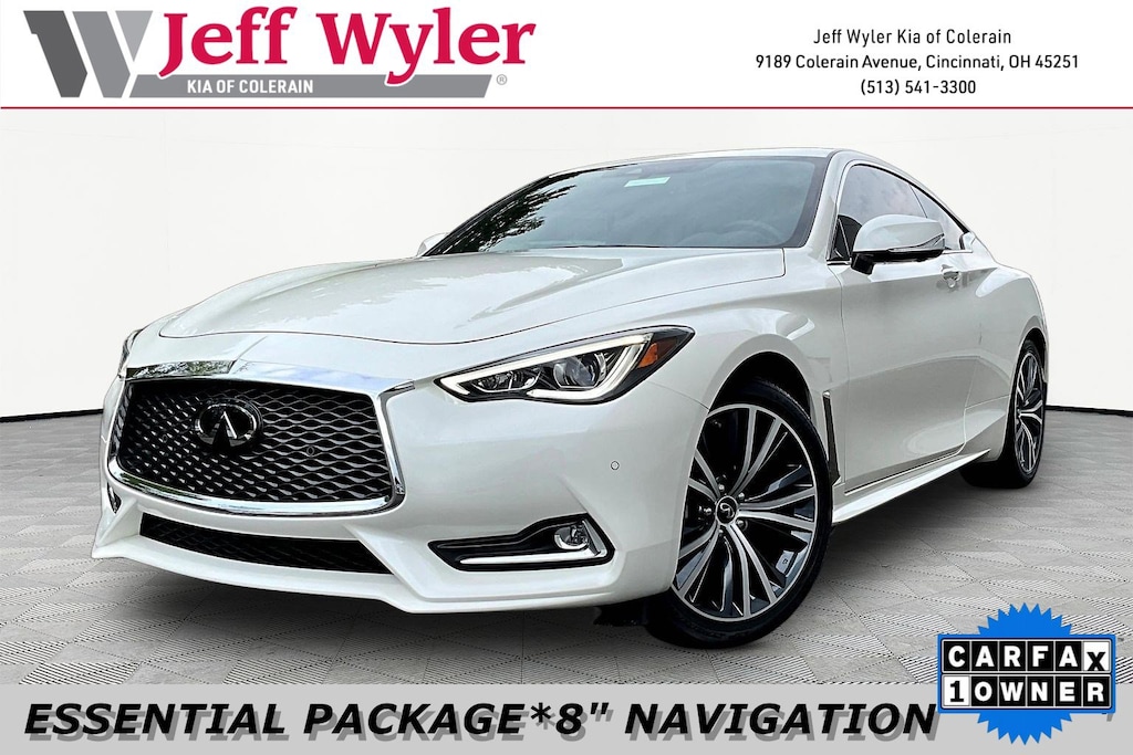 Jeff Wyler Kia of Colerain is pleased to offer this terrific 2022 INFINITI Q60 LUXE in Majestic White. Cargo Package (Cargo Net, Carpeted Trunk Mat, and First Aid Kit), Essential Package (Advanced Climate Control System, Auto-Dimming Exterior Mirrors w/Reverse Tilt-Down, Dual-Occupant Memory System For Driver Seat, and Power Tilt & Telescopic Steering Column), 13 Speakers, 4-Wheel Disc Brakes, ABS brakes, Air Conditioning, Alloy wheels, AM/FM radio: SiriusXM, Apple CarPlay/Android Auto, Auto High-beam Headlights, Auto-dimming Rear-View mirror, Automatic temperature control, Blind Spot Warning, Brake assist, Bumpers: body-color, Carbon Fiber Rear Decklid Spoiler, CD player, Compass, Delay-off headlights, Driver door bin, Driver vanity mirror, Dual front impact airbags, Dual front side impact airbags, Electronic Stability Control, Emergency communication system: INFINITI Connection, Four wheel independent suspension, Front anti-roll bar, Front Bucket Seats, Front Center Armrest, Front dual zone A/C, Front fog lights, Front reading lights, Fully automatic headlights, Garage door transmitter: HomeLink, Heated door mirrors, Heated Front Bucket Seats, Heated front seats, Heated steering wheel, Illuminated entry, Illuminated Kick Plates, Leather Shift Knob, Leather steering wheel, Literature Kit, Low tire pressure warning, Navigation System, Occupant sensing airbag, Outside temperature display, Overhead airbag, Overhead console, Panic alarm, Passenger door bin, Passenger vanity mirror, Power door mirrors, Power driver seat, Power moonroof, Power passenger seat, Power steering, Power windows, Radio data system, Radio: INFINITI InTouch w/AM/FM/HD/CD, Rain sensing wipers, Rear anti-roll bar, Rear window defroster, Remote keyless entry, Security system, Semi-Aniline Leather-Appointed Seating Surfaces, Speed control, Speed-sensing steering, Speed-Sensitive Wipers, Steering wheel mounted audio controls, Tachometer, Telescoping steering wheel, Tilt steering wheel, Traction control, Trip computer, Turn signal indicator mirrors, Variably intermittent wipers, and Wheels: 19" x 9" Aluminum-Alloy Our PRE-OWNED vehicles are put through a rigorous 167- POINT QUALITY ASSURANCE INSPECTION along with an average amount of over $1,400.00 SPENT to recondition each vehicle so we can be sure to deliver you the highest quality vehicle like you deserve! ***ONLINE PRICE DOES NOT INCLUDE WYLER FAMILY FIRST PACKAGE***