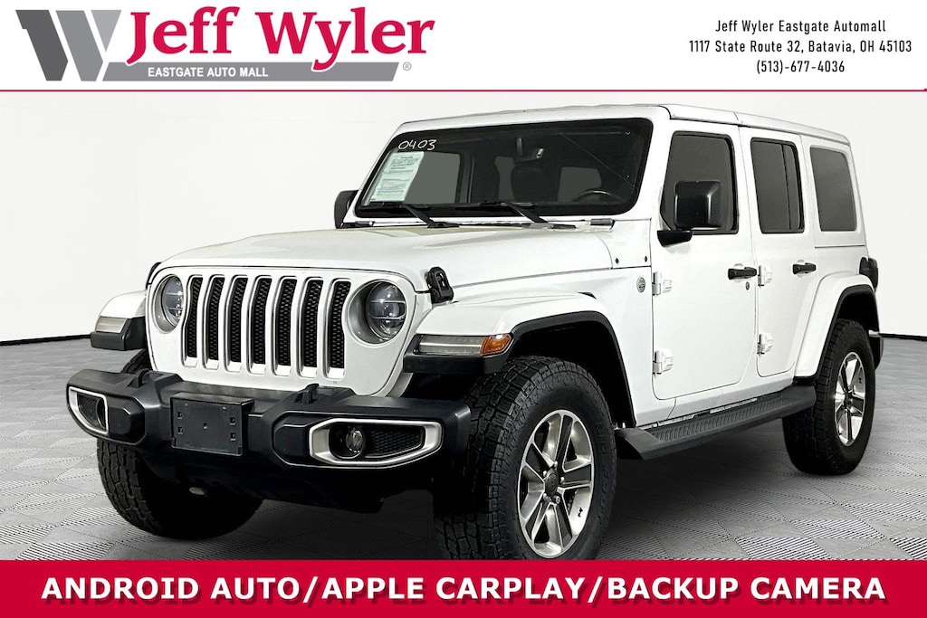 Jeff Wyler Eastgate Auto Mall is proud to offer this gorgeous 2019 Jeep Wrangler Unlimited Sahara in Bright White Clearcoat. Well equipped with: 8.4" Radio & Premium Audio Group (1-Year SiriusXM Guardian Trial, 4G LTE Wi-Fi Hot Spot, 5-Year SiriusXM Traffic Service, 5-Year SiriusXM Travel Link Service, 8.4" Touchscreen Display, Auto-Dimming Rear-View Mirror, Emergency/Assistance Call, For Details, Visit DriveUconnect.ca, GPS Navigation, HD Radio, Radio: Uconnect 4C Nav w/8.4" Display, SiriusXM Traffic Plus, and SiriusXM Travel Link), Cold Weather Group (Heated Front Seats and Heated Steering Wheel), LED Lighting Group (Daytime Running Lamps LED Accents, Front LED Fog Lamps, LED Reflector Headlamps, and LED Taillamps), Quick Order Package 24G, Safety Group (Blind Spot & Cross Path Detection and ParkSense Rear Park Assist System), 3.45 Rear Axle Ratio, 4-Wheel Disc Brakes, 8 Speakers, ABS brakes, Air Conditioning, Alloy wheels, Alpine Premium Audio System, AM/FM radio: SiriusXM, Anti-Spin Differential Rear Axle, Apple CarPlay/Android Auto, Automatic temperature control, Body Color 3-Piece Hard Top, Brake assist, Cloth Low-Back Bucket Seats, Compass, Delay-off headlights, Driver door bin, Driver vanity mirror, Dual front impact airbags, Dual front side impact airbags, Electronic Stability Control, Freedom Panel Storage Bag, Front anti-roll bar, Front Bucket Seats, Front Center Armrest w/Storage, Front dual zone A/C, Front fog lights, Front reading lights, Fully automatic headlights, Garage door transmitter, Heated door mirrors, Heavy Duty Suspension w/Gas Shocks, Illuminated entry, Integrated roll-over protection, Leather steering wheel, Low tire pressure warning, MOPAR All-Weather Floor Mats, No Soft Top, Non-Lock Fuel Cap w/o Discriminator, Occupant sensing airbag, Outside temperature display, Panic alarm, ParkView Rear Back-Up Camera, Passenger door bin, Passenger vanity mirror, Power door mirrors, Power steering, Power windows, Radio data system, Radio: Uconnect 4 w/7" Display, Rear anti-roll bar, Rear reading lights, Rear Window Defroster, Rear Window Wiper/Washer, Remote keyless entry, Remote Proximity Keyless Entry, Remote Start System, Security system, Speed control, Split folding rear seat, Steering wheel mounted audio controls, Tachometer, Telescoping steering wheel, Tilt steering wheel, Traction control, Trip computer, Variably intermittent wipers, Voltmeter, and Wheels: 18" x 7.5" Polished w/Gray SpokeS. Clean CARFAX. Ask about available certifications. Used vehicles 10 years of age or newer with less than 100,000 miles are eligible for the Wyler Assurance Program, but eligible vehicles must pass our reconditioning process and multi-point inspection. Provided the vehicle passes inspection, vehicles will be eligible for the 6 month/6,000 mile limited warranty. The 6 month/6,000 mile limited warranty is NOT available on AS-IS vehicles, wholesale vehicles, lease buyback/pass-thru vehicles or un-inspected vehicles. Note that this program can also apply to vehicles where the remaining factory coverage is less than 6 months or 6,000 miles. Please check the Federal Trade Commission (FTC) Buyers guide on the vehicle for full details as to whether or not warranty coverage may apply. Contact Dealer for additional details. The Wyler Assurance 6 month/6,000 Mile limited warranty ends 6 months from the date of the Retail Purchase Agreement (BUYERS ORDER) or when the vehicle's odometer registers 6,000 additional miles to the mileage listed on the BUYERS ORDER, whichever comes first. Your Deductible - The warranty holder on your contract pays the first $100 of each covered repair.