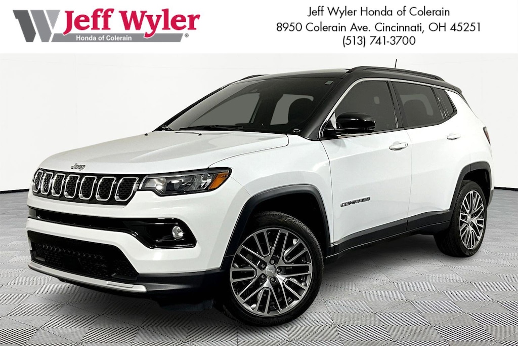 Jeff Wyler Honda of Colerain is delighted to offer this attractive-looking 2023 Jeep Compass Limited in Bright White Clearcoat. Well equipped with: Quick Order Package 29G, Sun and Sound Group (DISC) (Power Front/Fixed Rear Full Sunroof and Premium Alpine Speaker System), 10.1" Touchscreen Display, 3.73 Final Drive Ratio, 4-Wheel Disc Brakes, 6 Speakers, ABS brakes, Air Conditioning, Alloy wheels, AM/FM radio: SiriusXM, Auto High-beam Headlights, Auto-dimming Rear-View mirror, Automatic temperature control, Brake assist, Bumpers: body-color, Compass, Delay-off headlights, Disassociated Touchscreen Display, Driver door bin, Driver vanity mirror, Dual front impact airbags, Dual front side impact airbags, Electronic Stability Control, Four wheel independent suspension, Front anti-roll bar, Front Bucket Seats, Front Center Armrest w/Storage, Front dual zone A/C, Front fog lights, Front License Plate Bracket, Front reading lights, Fully automatic headlights, Heated door mirrors, Heated front seats, Heated steering wheel, Hidden Exhaust Tips-Dual, Illuminated entry, Knee airbag, Leather Shift Knob, Leatherette Seats, Low tire pressure warning, Occupant sensing airbag, Outside temperature display, Overhead airbag, Overhead console, Panic alarm, ParkView Rear Back-Up Camera, Passenger door bin, Passenger vanity mirror, Power door mirrors, Power driver seat, Power steering, Power windows, Radio: Uconnect 5 w/10.1" Display, Rain sensing wipers, Rear anti-roll bar, Rear seat center armrest, Rear window defroster, Rear window wiper, Remote keyless entry, Security system, SiriusXM Radio Service, Speed control, Split folding rear seat, Spoiler, Steering wheel mounted audio controls, Tachometer, Telescoping steering wheel, Tilt steering wheel, Traction control, Trip computer, Turn signal indicator mirrors, Variably intermittent wipers, Wheels: 18" x 7" Painted Diamond Cut Aluminum, and Wheels: 19" x 7.5" Painted Diamond Cut Aluminum.