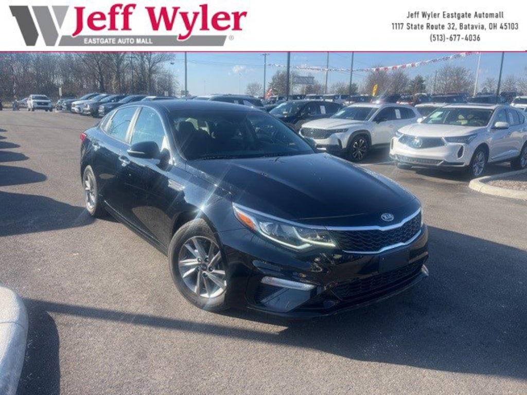 Jeff Wyler Eastgate Auto Mall is excited to offer this outstanding-looking 2019 Kia Optima LX in Ebony Black. Well equipped with: 4-Wheel Disc Brakes, 6 Speakers, 6.5J x 16" Silver Alloy Wheels, ABS brakes, Air Conditioning, Alloy wheels, AM/FM radio, Anti-whiplash front head restraints, Apple CarPlay & Android Auto, Auto High-beam Headlights, Brake assist, Bumpers: body-color, Carpet Floor Mats, Cloth Seat Trim, Delay-off headlights, Driver door bin, Driver vanity mirror, Dual front impact airbags, Dual front side impact airbags, Electronic Stability Control, Four wheel independent suspension, Front anti-roll bar, Front Bucket Seats, Front Center Armrest, Front reading lights, Fully automatic headlights, Heated door mirrors, Illuminated entry, Knee airbag, Low tire pressure warning, Occupant sensing airbag, Outside temperature display, Overhead airbag, Overhead console, Panic alarm, Passenger door bin, Passenger vanity mirror, Power door mirrors, Power steering, Power windows, Radio data system, Radio: AM/FM/MP3 Audio System, Rear anti-roll bar, Rear Bumper Applique, Rear seat center armrest, Rear window defroster, Remote keyless entry, Security system, Speed control, Speed-sensing steering, Split folding rear seat, Steering wheel mounted audio controls, Tachometer, Telescoping steering wheel, Tilt steering wheel, Traction control, Trip computer, Turn signal indicator mirrors, and Variably intermittent wipers. Clean CARFAX. Awards: * 2019 KBB.com 10 Most Comfortable Cars Under $30,000 * 2019 KBB.com 10 Best Sedans Under $30,000 Ask about available certifications. Used vehicles 10 years of age or newer with less than 100,000 miles are eligible for the Wyler Assurance Program, but eligible vehicles must pass our reconditioning process and multi-point inspection. Provided the vehicle passes inspection, vehicles will be eligible for the 6 month/6,000 mile limited warranty. The 6 month/6,000 mile limited warranty is NOT available on AS-IS vehicles, wholesale vehicles, lease buyback/pass-thru vehicles or un-inspected vehicles. Note that this program can also apply to vehicles where the remaining factory coverage is less than 6 months or 6,000 miles. Please check the Federal Trade Commission (FTC) Buyers guide on the vehicle for full details as to whether or not warranty coverage may apply. Contact Dealer for additional details. The Wyler Assurance 6 month/6,000 Mile limited warranty ends 6 months from the date of the Retail Purchase Agreement (BUYERS ORDER) or when the vehicle's odometer registers 6,000 additional miles to the mileage listed on the BUYERS ORDER, whichever comes first. Your Deductible - The warranty holder on your contract pays the first $100 of each covered repair.