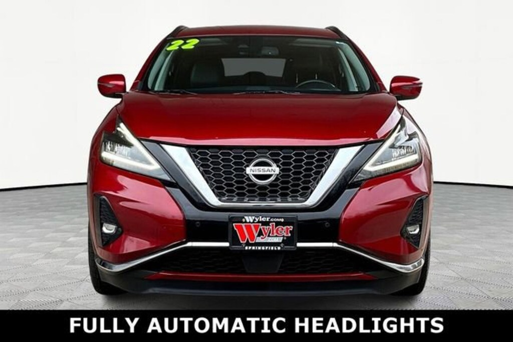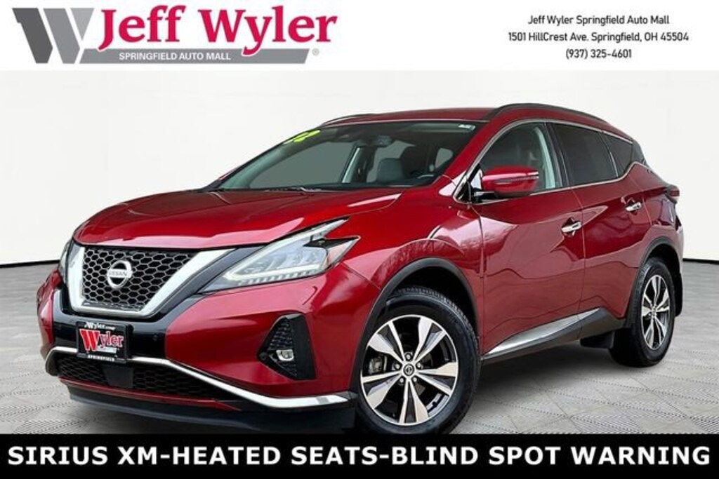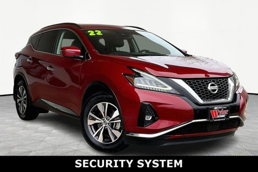 Jeff Wyler Springfield Auto Mall is excited to offer this outstanding 2022 Nissan Murano SV in Scarlet Ember Tintcoat. Well equipped with: 4-Wheel Disc Brakes, 4.667 Axle Ratio, 6 Speakers, ABS brakes, Air Conditioning, Alloy wheels, AM/FM radio: SiriusXM, AM/FM/CD/MP3/WMA Audio System, Auto High-beam Headlights, Auto-dimming Rear-View mirror, Automatic temperature control, Blind Spot Warning, Brake assist, Bumpers: body-color, Carpeted Floor Mats & Carpeted Cargo Mat, CD player, Child-Seat-Sensing Airbag, Delay-off headlights, Driver door bin, Driver vanity mirror, Dual front impact airbags, Dual front side impact airbags, Electronic Stability Control, Four wheel independent suspension, Front anti-roll bar, Front Bucket Seats, Front Center Armrest, Front dual zone A/C, Front fog lights, Front reading lights, Fully automatic headlights, Heated door mirrors, Heated Front Bucket Seats, Heated front seats, Illuminated entry, Knee airbag, Leatherette-Appointed Seat Trim, Low tire pressure warning, NissanConnect featuring Apple CarPlay and Android Auto, Occupant sensing airbag, Outside temperature display, Overhead airbag, Overhead console, Panic alarm, Passenger door bin, Passenger vanity mirror, Power door mirrors, Power driver seat, Power passenger seat, Power steering, Power windows, Radio data system, Rear anti-roll bar, Rear Bumper Protector, Rear reading lights, Rear seat center armrest, Rear side impact airbag, Rear window defroster, Rear window wiper, Remote keyless entry, Roof rack: rails only, Security system, Speed control, Speed-sensing steering, Speed-Sensitive Wipers, Splash Guards (B92), Split folding rear seat, Spoiler, Steering wheel mounted audio controls, Tachometer, Telescoping steering wheel, Tilt steering wheel, Traction control, Trip computer, Turn signal indicator mirrors, Variably intermittent wipers, and Wheels: 18 Machined Aluminum-Alloy. Ask about available certifications. Used vehicles 10 years of age or newer with less than 100,000 miles are eligible for the Wyler Assurance Program, but eligible vehicles must pass our reconditioning process and multi-point inspection. Provided the vehicle passes inspection, vehicles will be eligible for the 6 month/6,000 mile limited warranty. The 6 month/6,000 mile limited warranty is NOT available on AS-IS vehicles, wholesale vehicles, lease buyback/pass-thru vehicles or un-inspected vehicles. Note that this program can also apply to vehicles where the remaining factory coverage is less than 6 months or 6,000 miles. Please check the Federal Trade Commission (FTC) Buyers guide on the vehicle for full details as to whether or not warranty coverage may apply. Contact Dealer for additional details. The Wyler Assurance 6 month/6,000 Mile limited warranty ends 6 months from the date of the Retail Purchase Agreement (BUYERS ORDER) or when the vehicle's odometer registers 6,000 additional miles to the mileage listed on the BUYERS ORDER, whichever comes first. Your Deductible - The warranty holder on your contract pays the first $100 of each covered repair.